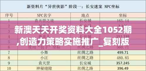 在数字娱乐领域,新澳天天开奖资料大全以其丰富和及时的信息更新而受到广泛关注。第1052期的资料大全为参与者提供了一个全面的指南,涵盖了彩票开奖的最新趋势、策略分析以及复刻版20.397的推广信息。本文将详细介绍这一期资料大全的主要内容,包括创造力策略的实施推广以及复刻版20.397的相关细节。