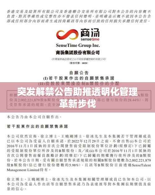 突发解禁公告的发布,是透明化管理的重要体现,也是保障公众知情权的重要方式,随着时代的进步,透明化管理将成为社会发展的重要趋势,我们应该加强对此的关注和研究,推动社会的透明化管理,促进社会的发展和进步,政府和相关机构也应该加强信息公开和透明度,加强与公众的沟通和互动,提高政府的公信力和形象,只有这样,才能更好地推动社会的发展和进步,实现社会的和谐稳定。