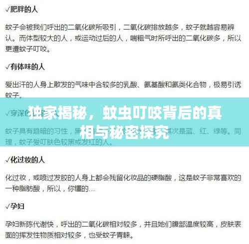 蚊虫叮咬背后隐藏着许多秘密,通过了解这些秘密,我们可以更好地保护自己,避免被蚊虫叮咬,希望本文的独家揭秘能帮助您更好地了解蚊虫叮咬,保护您和家人的健康。