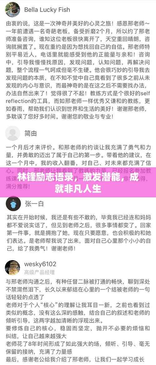 林锋励志语录摘抄为我们提供了宝贵的人生经验和智慧,让我们以此为指引,坚定信念,勇往直前,创造属于自己的辉煌人生,无论遇到什么困难,都要牢记这些语录中的精神内涵,不断激励自己前行。