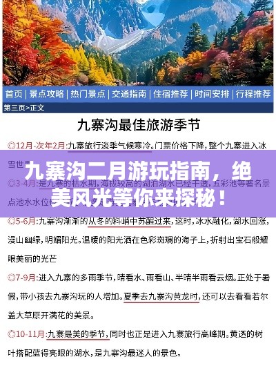 九寨沟,这个被誉为“人间仙境”的自然奇观之地,以其独特的地貌、瑰丽的风景和丰富的生态资源吸引着无数游客,而二月份的九寨沟,虽然处于冬季,但依然有着别样的魅力,本文将为您提供一份详尽的九寨沟二月份旅游攻略,带您领略这片土地的冬日之美。
